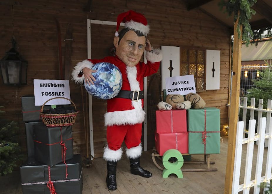 Le 7 décembre 2017 à Paris, à quelques jours du « One Planet Summit », un militant d’Oxfam déguisé en Emmanuel Macron pour sensibiliser à la lutte contre le changement climatique. Jacques Demarthon/AFP