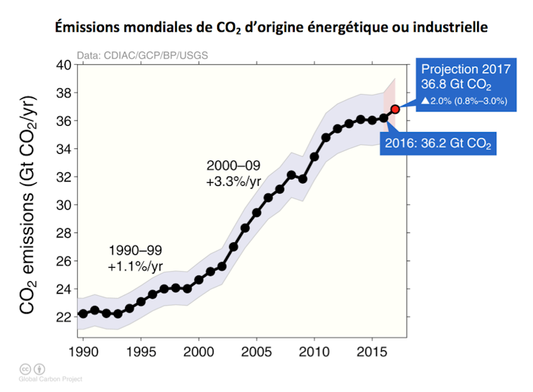 Vingt-cinq ans après l’adoption de la Convention sur les changements climatiques (1992), on ne détecte toujours pas d’inflexion décisive dans la courbe d’émission mondiale du CO2, le principal gaz à effet de serre d’origine anthropique (voir le graphique ci-dessous à ce propos). La négociation climatique entre gouvernements donne l’impression d’une course de lenteur.