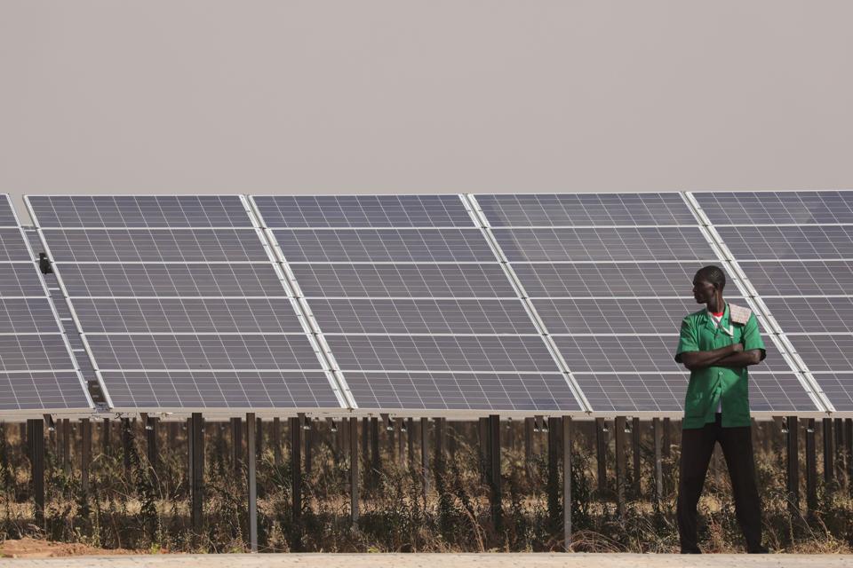 Les gens se tiennent à côté des panneaux solaires de la centrale solaire de Zaktubi, près de Ouagadougou, le 29 novembre, le jour de son inauguration. (LUDOVIC MARIN/AFP/Getty Images)