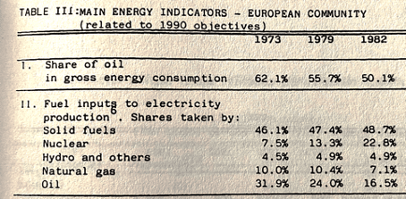 À cette époque, le pétrole, bon marché et facile à utiliser, remplace le charbon. Lors de la création de la Communauté européenne du charbon et de l’acier, en 1950, le charbon représentait 80 % de la consommation d’énergie des Six. Ce chiffre est tombé à 65 % en 1960 et à 30 % en 1970 : il est aujourd’hui de 12 %. La Communauté européenne, qui était indépendante sur le plan énergétique, devenait ainsi progressivement dépendante du monde extérieur, d’une nouvelle source d’énergie et d’une région du monde, le Moyen-Orient. Mais qui s’en souciait ? La sécurité de l’approvisionnement énergétique avait bien été évoquée en 1968 dans un premier document de la Commission européenne intitulé « Première orientation de la politique énergétique de la Communauté européenne ». Il proposait des prévisions et des orientations à moyen terme pour chaque source d’énergie, l’établissement d’un marché commun, ce qui implique la mise en œuvre de règles communes, la mise en œuvre d’une politique d’approvisionnement sûre et bon marché, et l’établissement de programmes de recherche et de développement dans le domaine des hydrocarbures : le traité CECA le prévoyait déjà pour le charbon et Euratom pour l’énergie nucléaire. Comme son titre l’indiquait, il ne s’agissait que d’orientations, il n’était pas question de mise en œuvre. Il a fallu le réveil brutal des chocs pétroliers pour que ces idées soient appliquées.